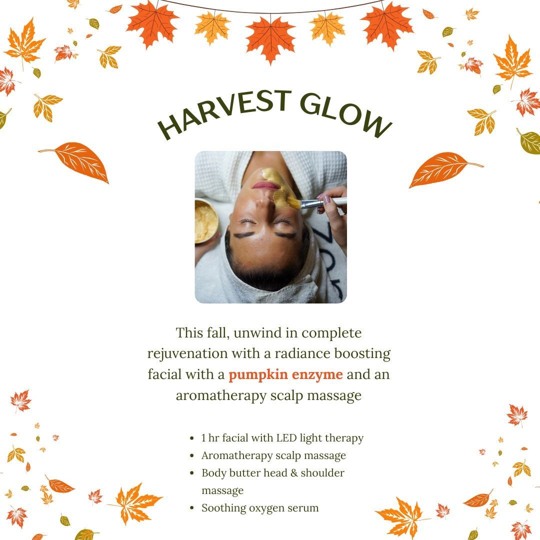The Harvest Glow Facial offers a revitalizing skincare experience that features a pumpkin enzyme mask to nourish the skin, complemented by LED light therapy to enhance natural elastin and collagen production for a luminous glow.