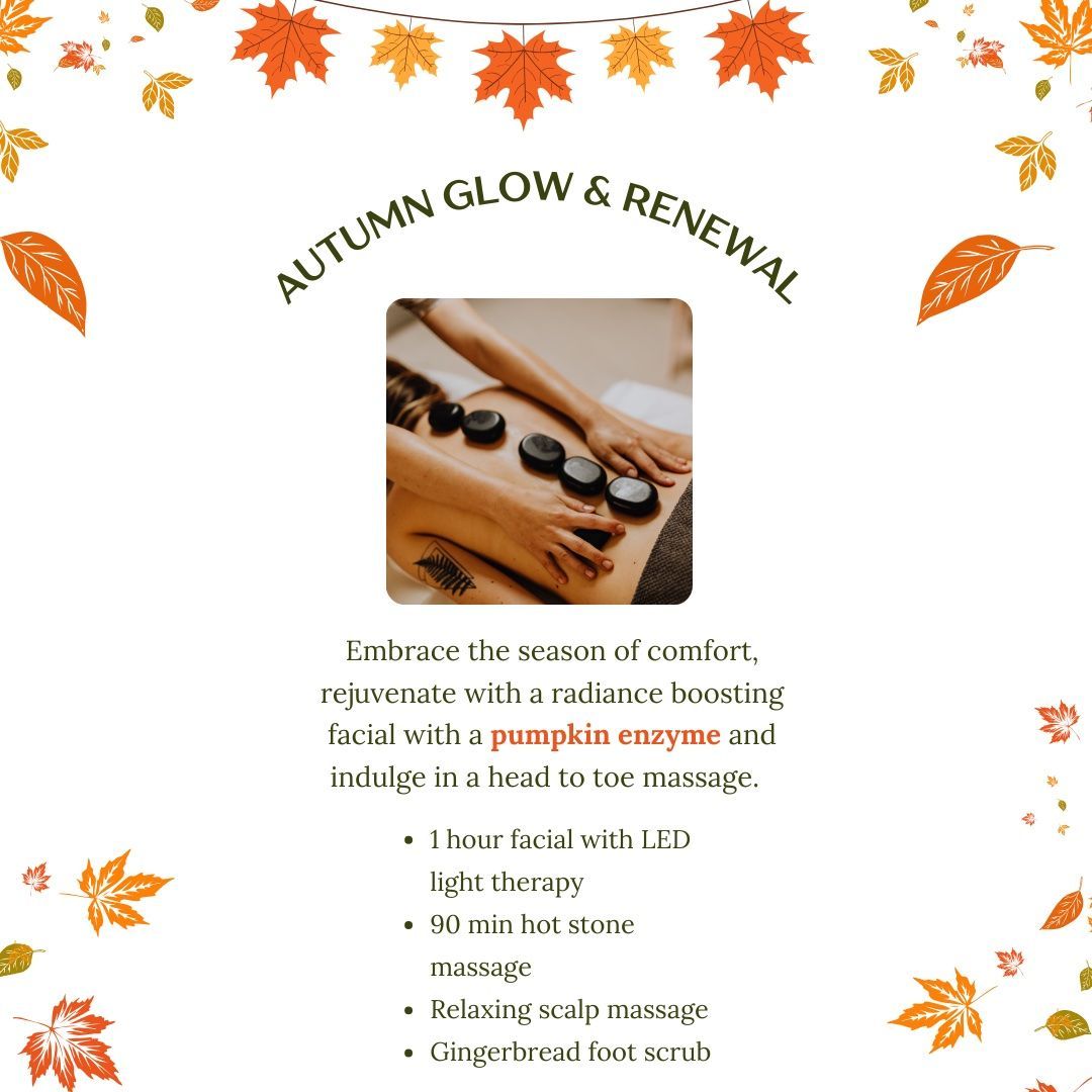 Experience the essence of autumn with our Autumn Glow & Renewal Package, featuring a radiance-boosting facial enhanced by a nourishing pumpkin enzyme mask.